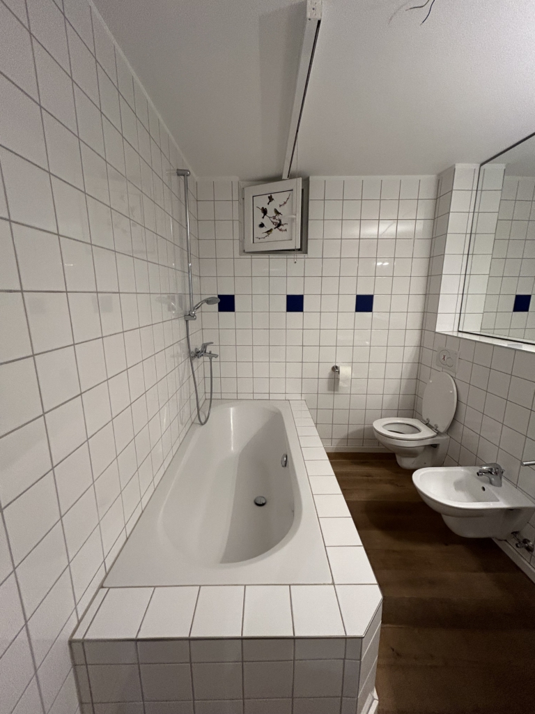 Auf der rechten Seite des Flurs sind zwei Zimmer vorhanden. Ein Zimmer fungiert als Durchgangzimmer. Es würde sich beispielsweise anbieten, diese beiden Räume als Kinderzimmer mit separatem Schlaf- und Spielbereich zu nutzen. In einem dieser Räume ist eine weiße Wandvertäfelung angebracht. Ein schöner Raum mit Fachwerkabtrennung, ein großes Badezimmer mit Badewanne, Dusche, Toilette und Waschbecken in weißer Fliesen- und Sanitärfarbe sowie ein separates WC und ein Raum für die Gastherme runden das Raumangebot dieser Wohnung ab.