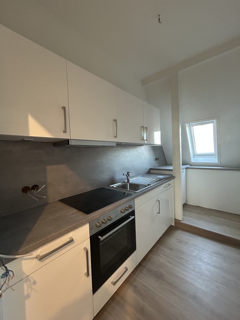 Diese frisch sanierte Wohnung befindet sich im Dachgeschoss eines herrschaftlichen Gebäudes. Beim Betreten der Wohnung gelangt man zunächst in einen Vorraum, der als Diele fungiert. Hier ist ausreichend Platz für eine Garderobe vorhanden. Eine Tür führt in das großzügige Wohn- und Esszimmer mit Schlafbereich. Links gelegen befinden sich die Küche und das Badezimmer. In der Küche wird eine neue Einbauküche mit hochglanz-weißen Fronten und diversen Ober- und Unterschränken eingebaut. Die Einbauküche besteht aus einem Herd mit Cerankochfeld, einer Dunstabzugshaube, einer Spüle, einem Kühlschrank mit Gefrierfach, einem Backofen und einem Geschirrspüler. Neben der Küche liegt das Tageslichtbadezimmer. Die Sanitärkeramik des Badezimmers ist weiß und besteht aus einem WC, einem Waschbecken und einer Dusche. Vor dem Bad sind Einbauschränke in einer Nische vorhanden, um zusätzlich Stauraum zu schaffen.